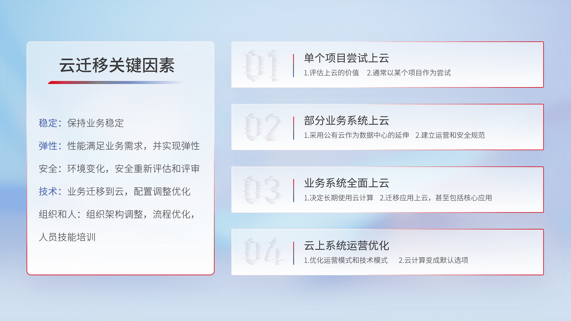 结合实际业务,,,,从规划设计、、、云平台选型、、、、云原生改造、、、数据迁移、、、、集成交付,,,迁移全过程为客户识别最佳上云路径,,,,做好风险识别管理,,,设计网络架构、、、身份权限、、安全审计合规、、操作审计、、日志审计、、、监控告警策略、、、多站点容灾设计等,,,,对云上基础设施进行整体规划,,,,提升IT治理水平,,,以满足弹性、、、高可用、、、高性能的需求。。